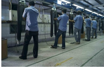 d) 膠球(GREEN BALL、RUBBER BALL):膠球是一種用有機樹脂合成的表面很粗糙的球狀膠體,一般用于較輕度的打磨。因某些客戶要求洗水后衣衫需過驗針機,而石頭顆粒可能含有金屬礦物質,因而可以用膠球作為石頭的替代品